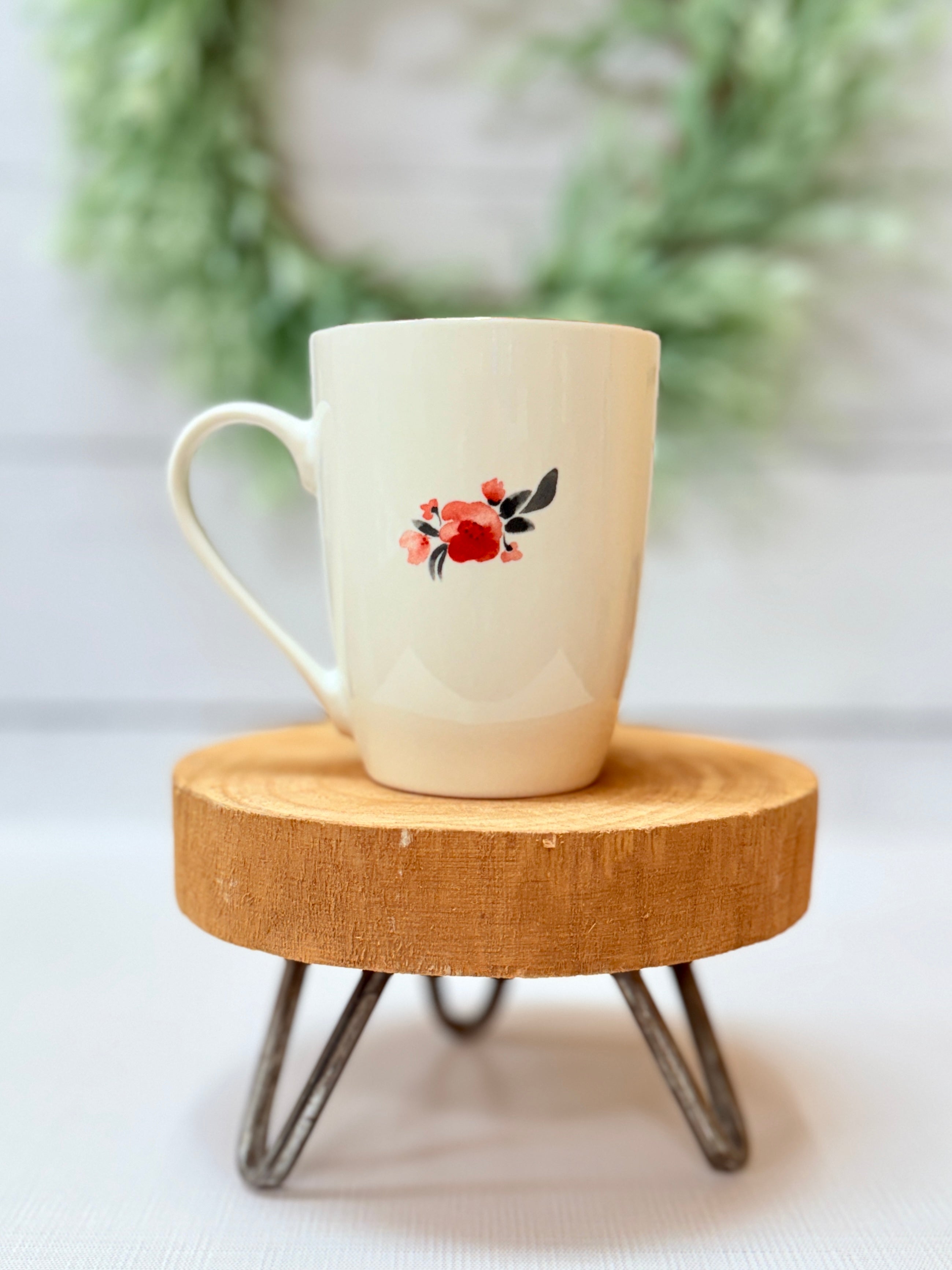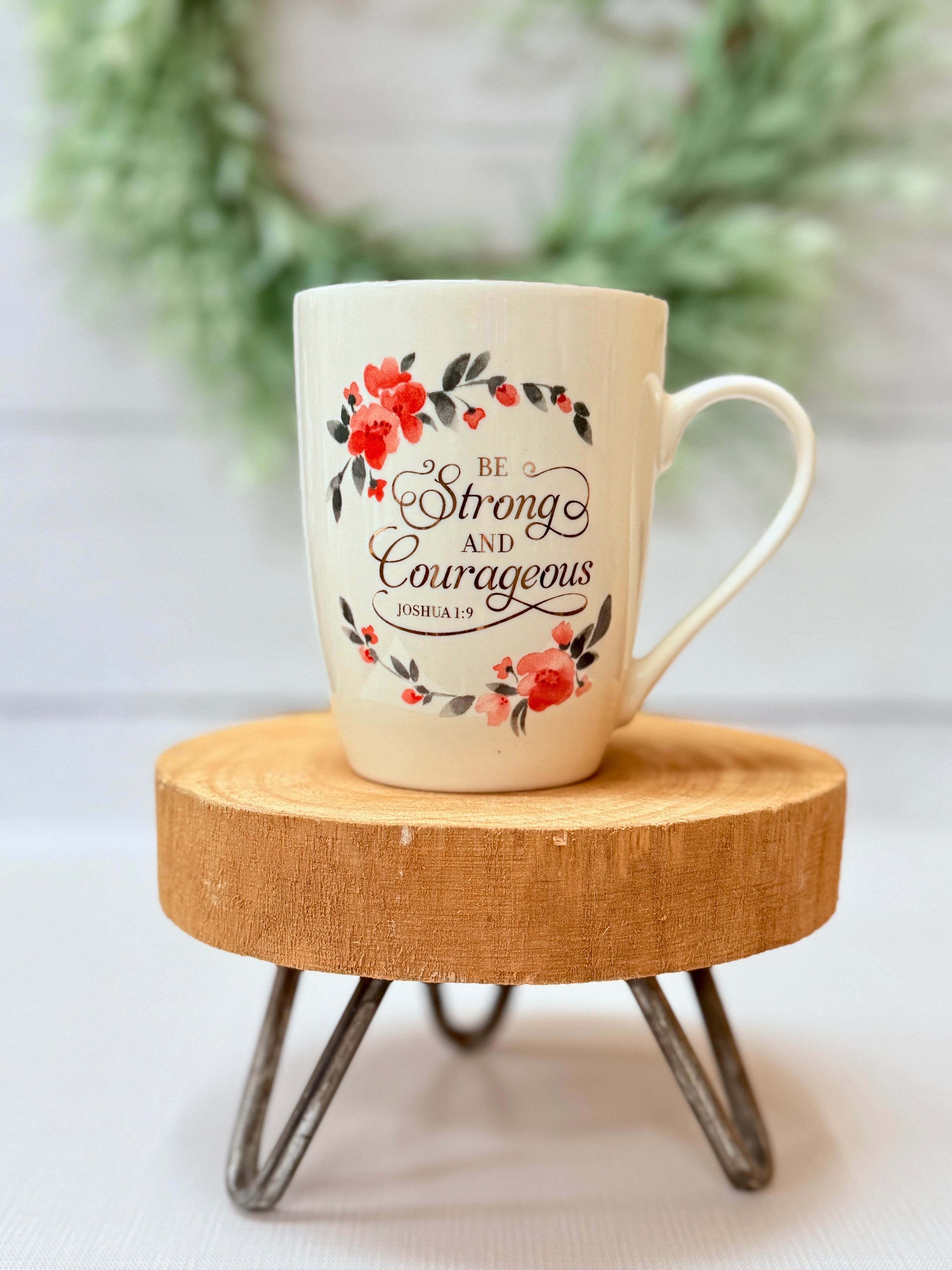 Find daily courage with every sip. This elegant mug features the empowering words from Joshua 1:9 — “Be strong and courageous.” Surrounded by soft red blooms, it’s a lovely reminder that faith gives strength in every season.