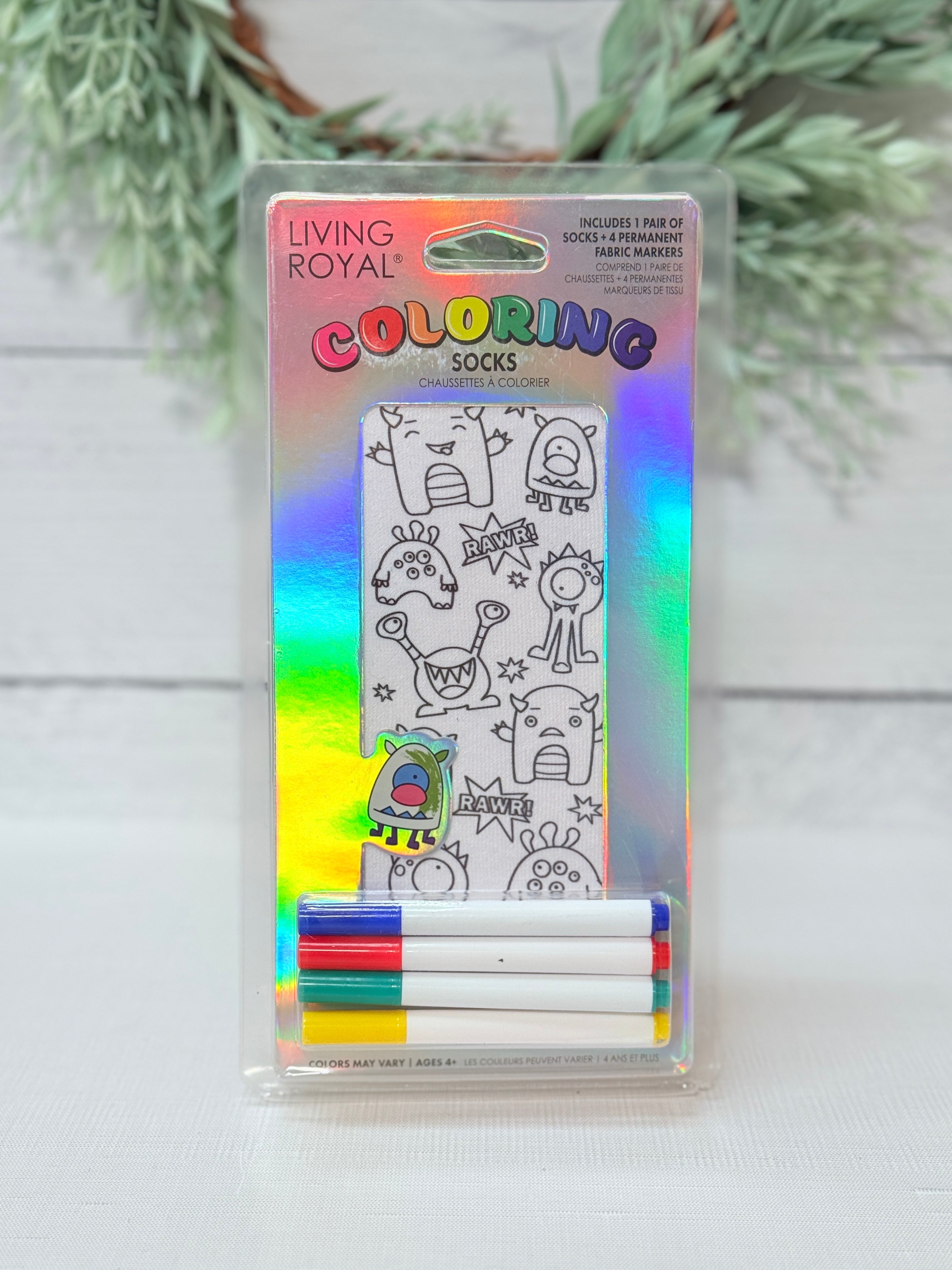 Unleash creativity (and a few giggles) with the Monster Madness Coloring Socks Kit! Each set includes one pair of socks covered in fun monster doodles — complete with “RAWR!” speech bubbles — plus four permanent fabric markers to bring these goofy creatures to life.