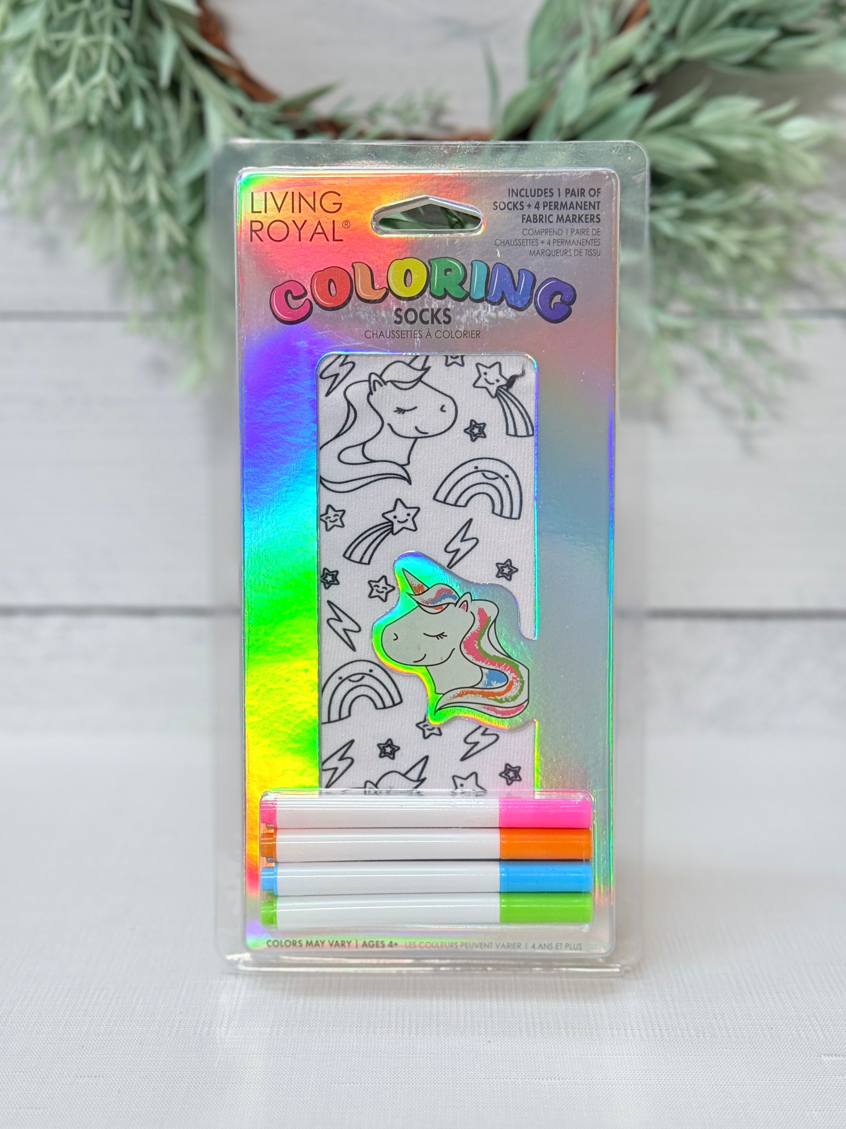 Bring your unicorn dreams to life with the Dreamy Unicorn Coloring Socks Kit! Each set includes one pair of socks featuring rainbows, stars, and unicorns — plus four permanent fabric markers to color your creation.