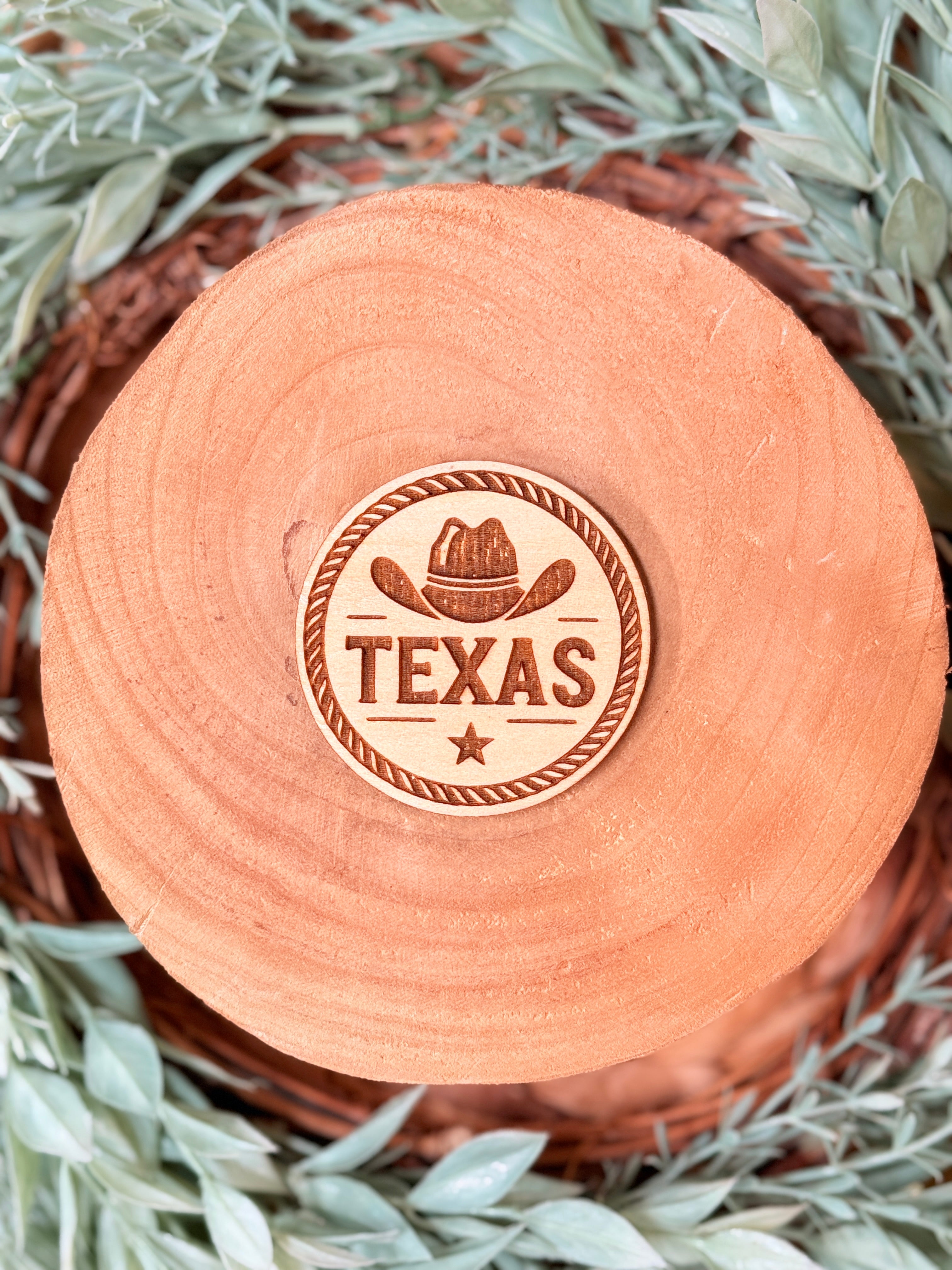 This round magnet features a cowboy hat, rope border, and star accent — all deeply engraved into natural wood for a rustic, authentic finish. It’s a simple yet timeless way to show off your Texas pride, whether on your fridge, locker, or office board.