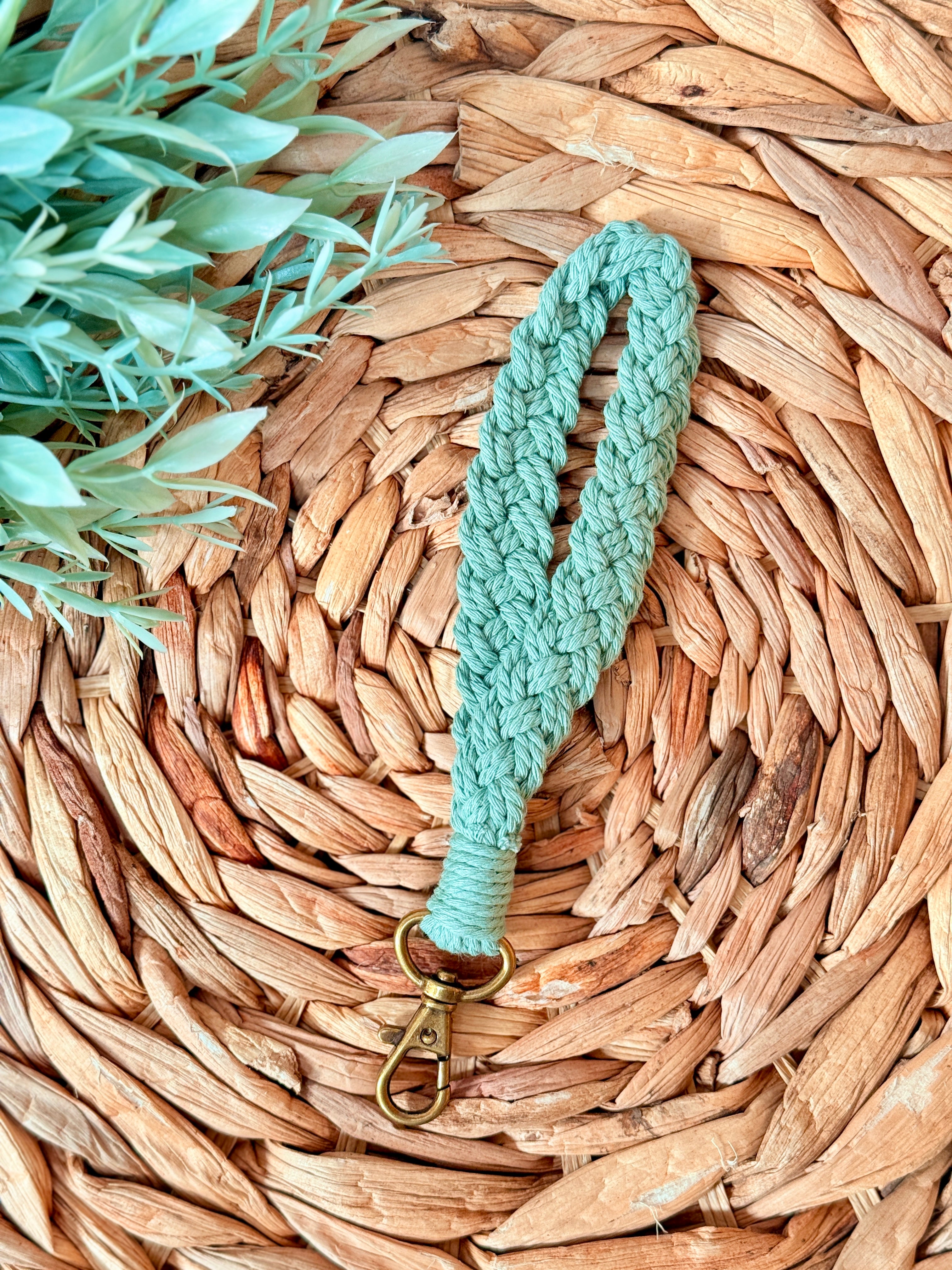 Keep your keys cute and easy to find with the Knotted Charm Keychain in soft sage green. Hand-woven in soft macramé cord, this textured keychain adds a boho touch to any bag or set of keys. Its sturdy clasp makes it practical for everyday use while the braided design brings effortless style to your daily essentials.