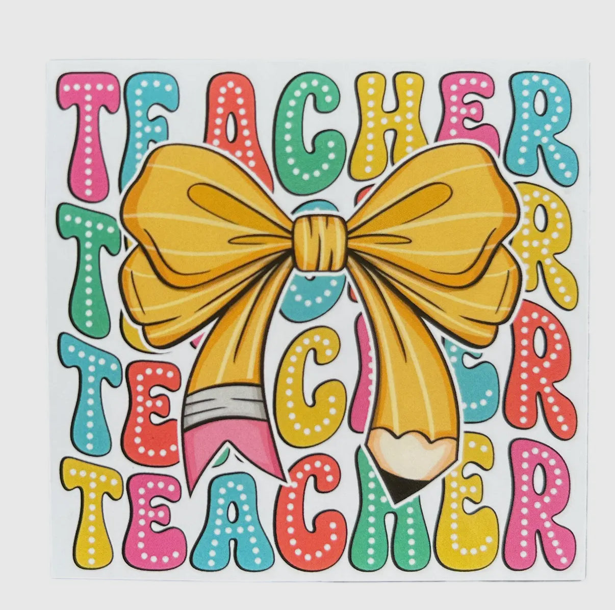 Show your love for the classroom in style with this colorful Teacher sticker! Featuring a bold yellow pencil bow over playful, dotted “TEACHER” text in bright colors, this vibrant vinyl sticker is the perfect pop of personality for laptops, water bottles, planners, or classroom supplies.