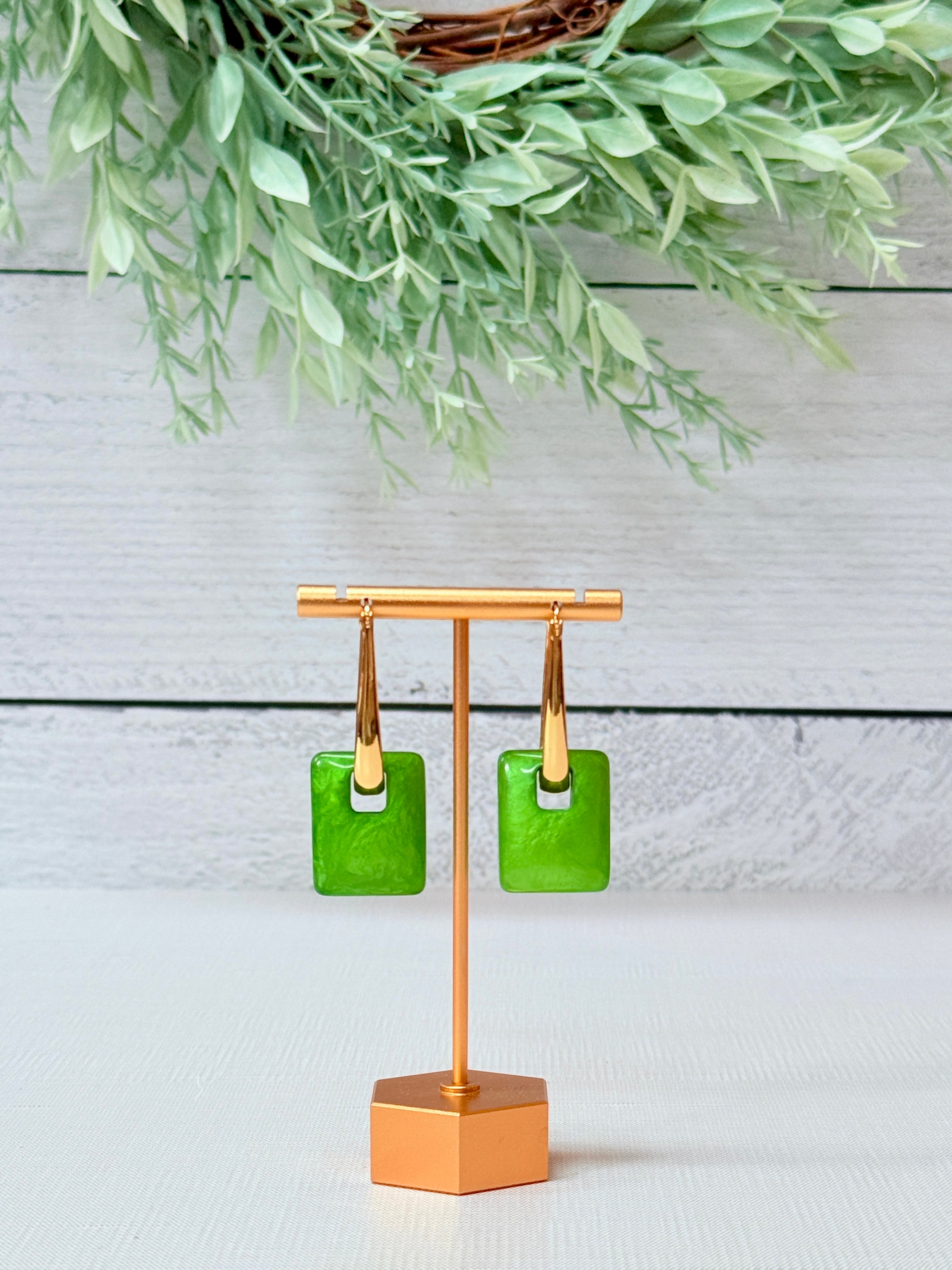 The Elena Earrings bring a bold mix of sleek gold and vivid green for a look that’s modern yet timeless. Their striking drop design makes them the perfect statement piece to add a pop of color and polish to any outfit.