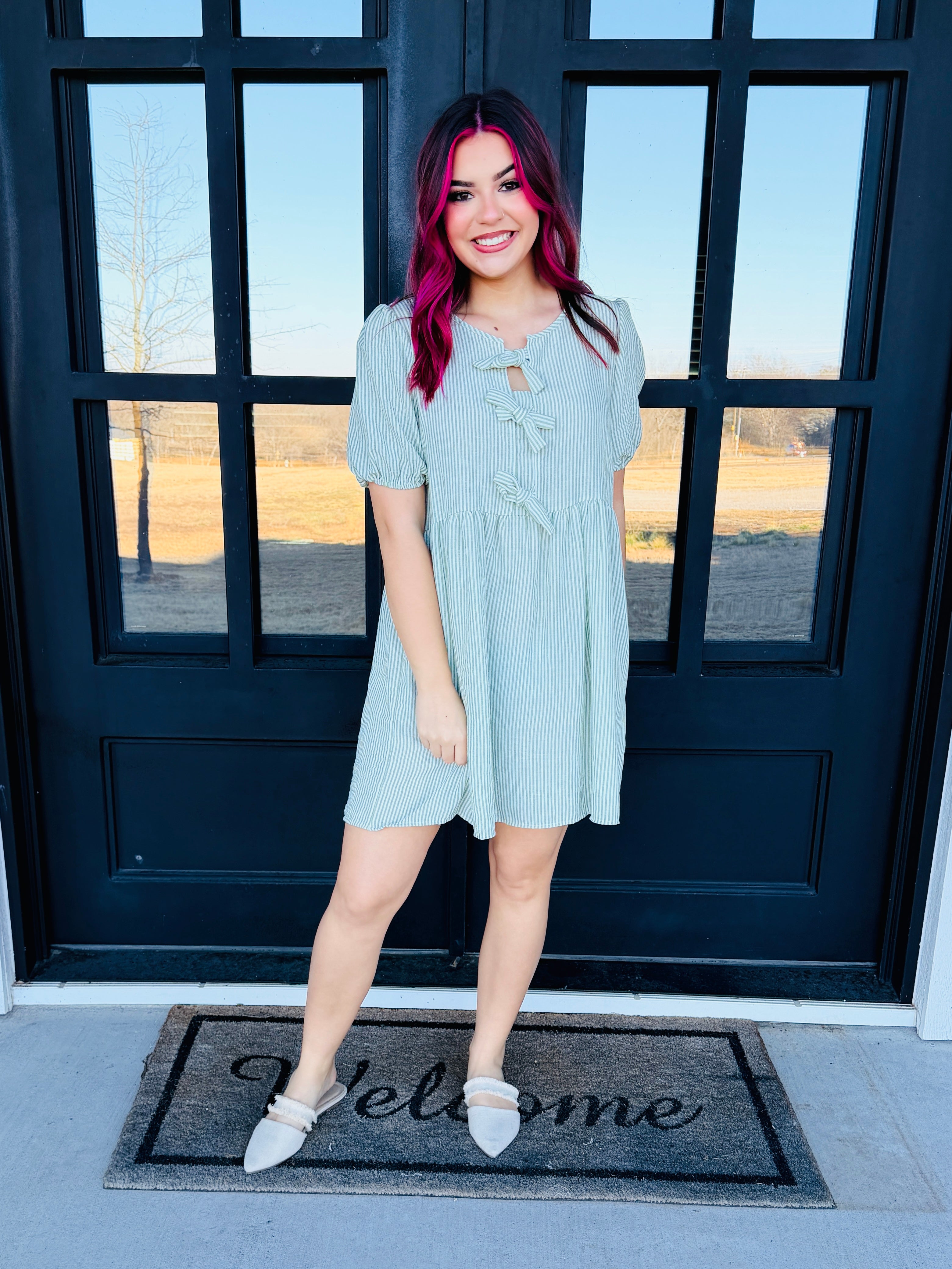 Soft, feminine, and effortlessly wearable, the Keep Me In Mind Striped Mini Dress is a boutique favorite made for sunny days and easy moments. Curated for our Anchored Bliss Boutique babes in Royse City, TX, this sage green striped dress features delicate bow details and a flattering silhouette that feels both classic and fresh.