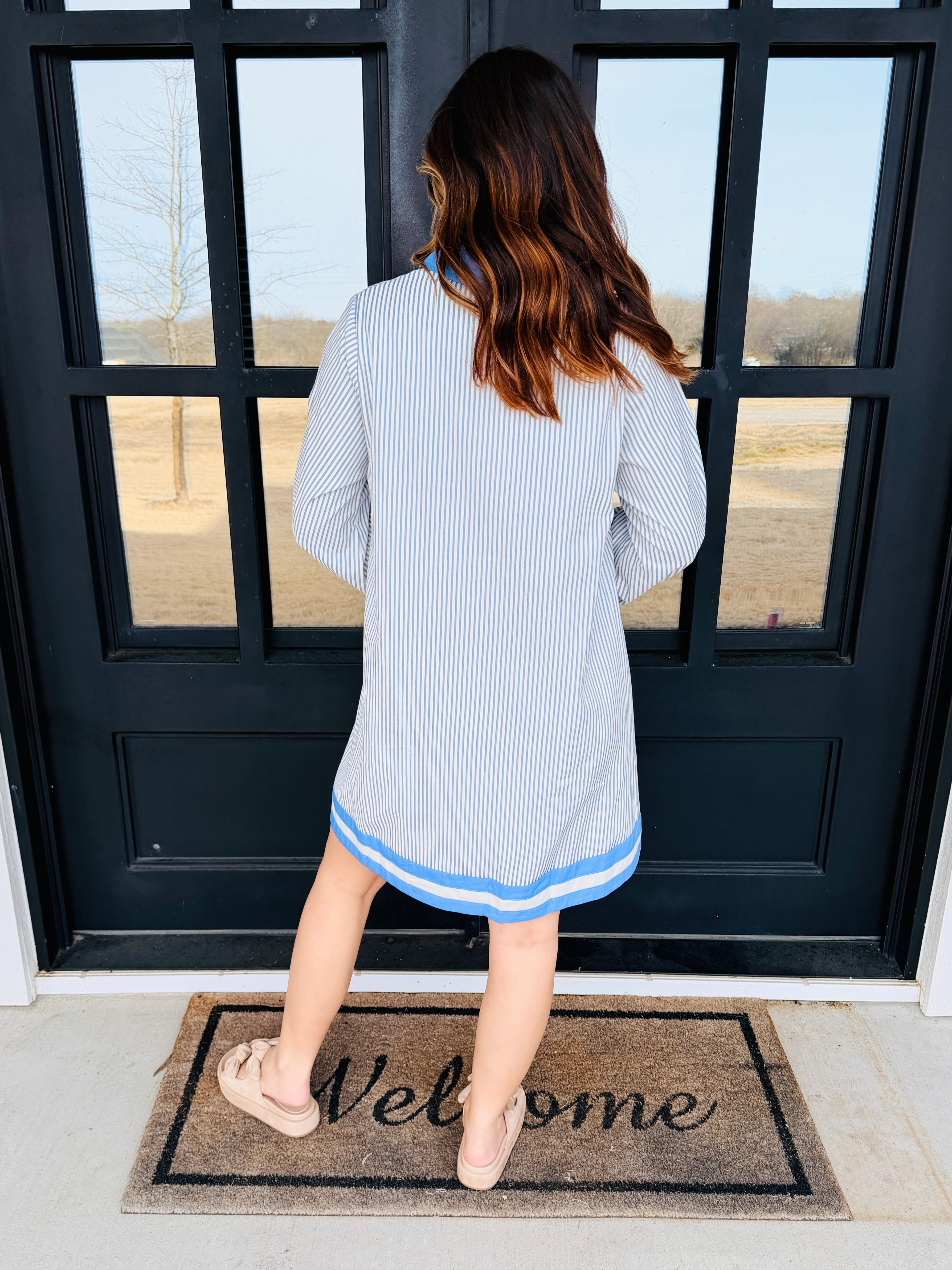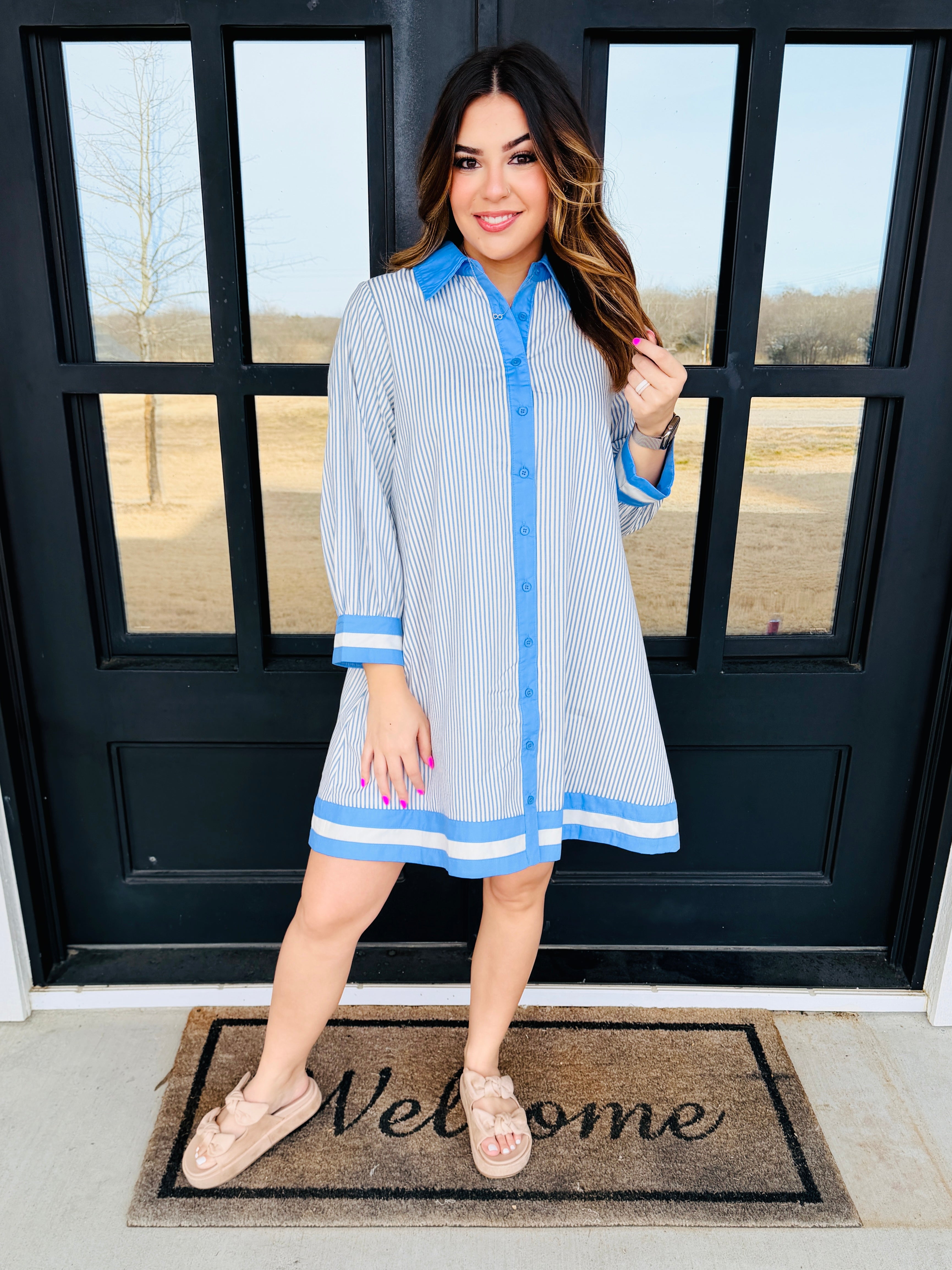 Timeless meets trendy in the So Happy Together Striped Mini Dress. Featuring crisp blue and white stripes with contrasting solid blue trim, this dress delivers a polished yet playful look you’ll love. The button-down front and relaxed silhouette make it effortlessly wearable, perfect for busy days, casual outings, or boutique strolls in Royse City, TX with Anchored Bliss Boutique.