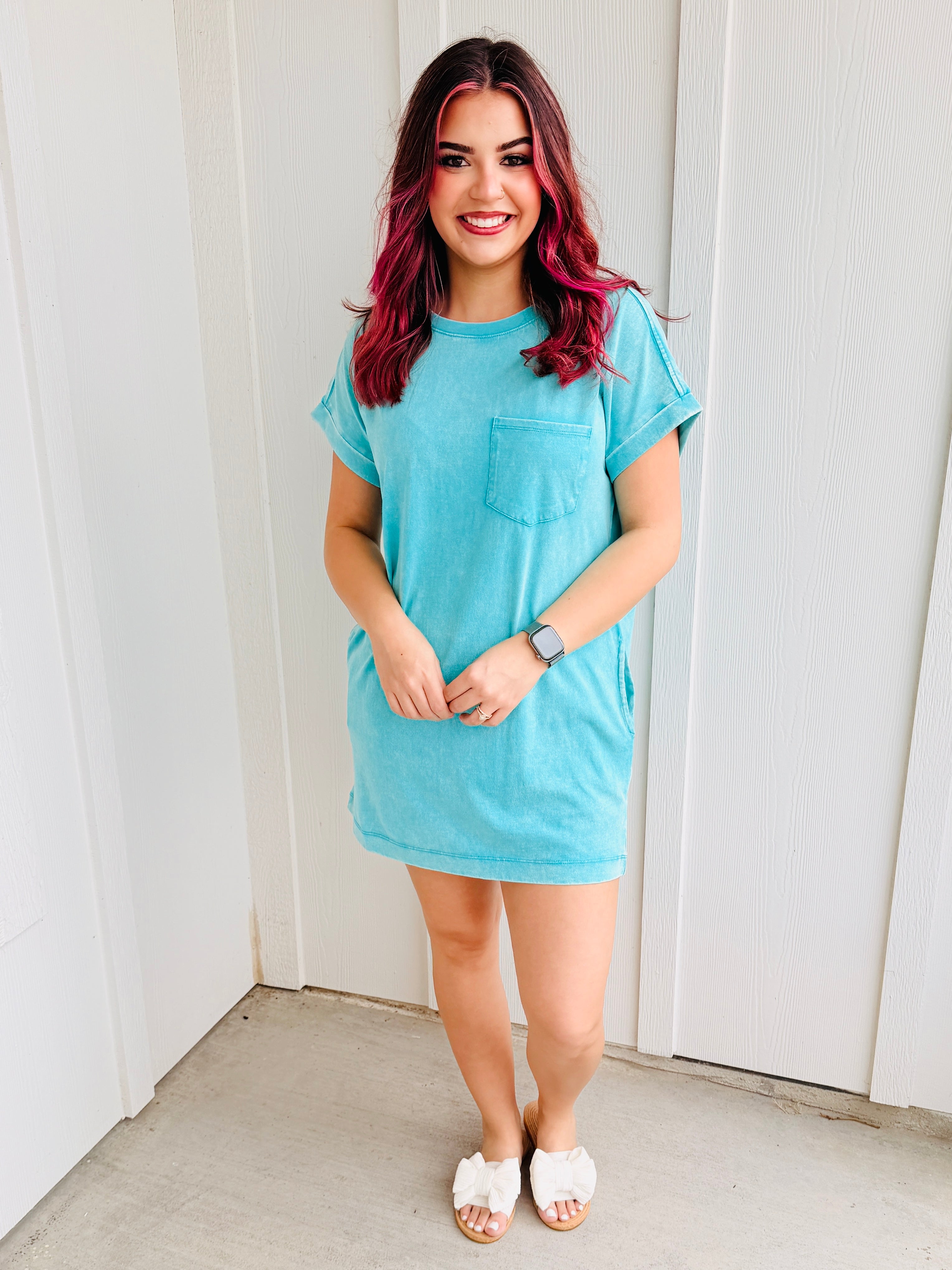 The Want Your Love Mineral Washed Pocket Tee Dress brings effortless comfort and relaxed boutique style together in one easy piece. Featuring a soft mineral-washed finish and classic t-shirt dress silhouette, this dress is designed for those laid-back days when you still want to look cute. Handpicked for our Anchored Bliss Boutique babes in Royse City, TX, the vibrant turquoise color adds the perfect pop of color to your everyday wardrobe.