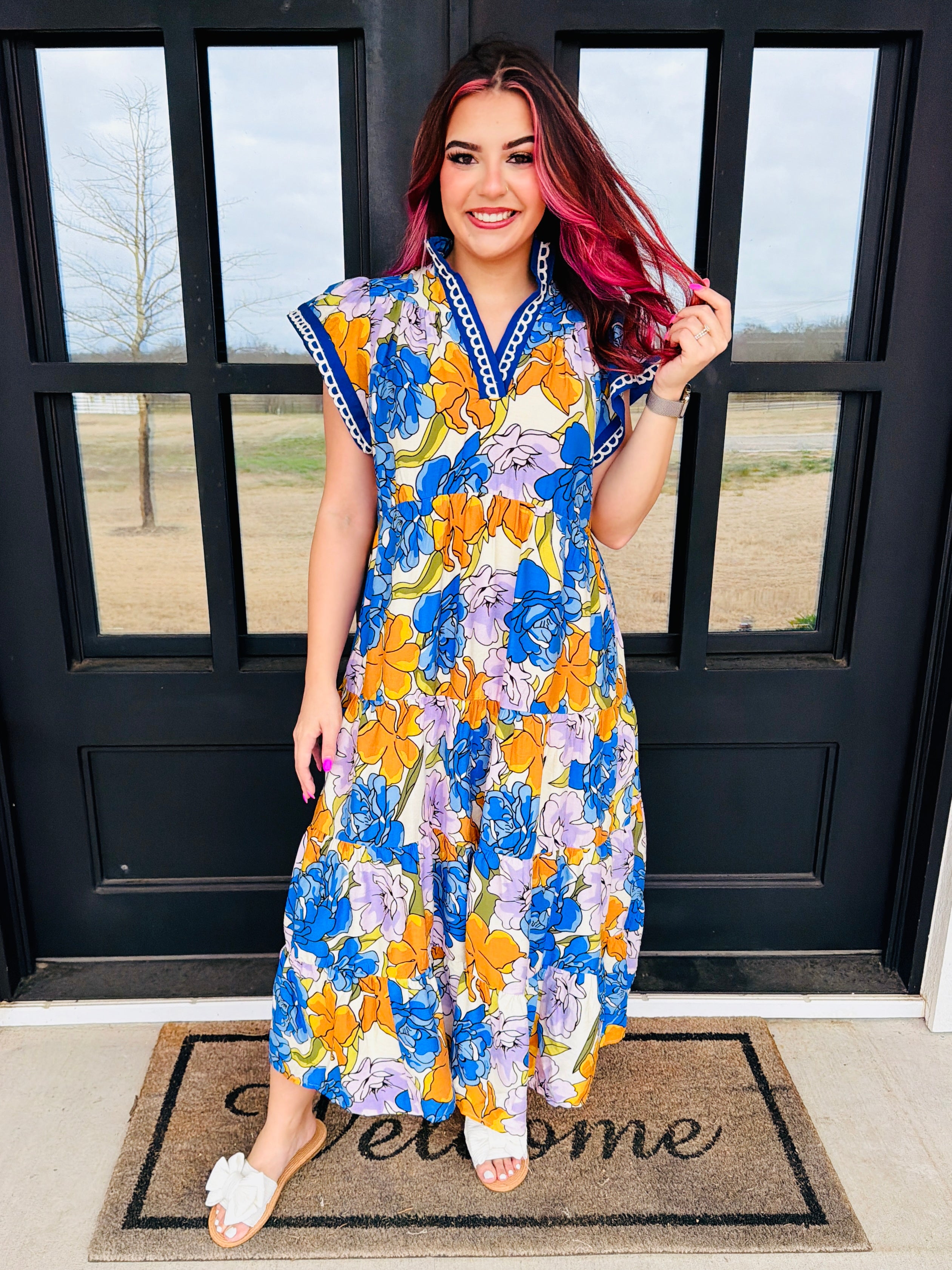 Feel beautiful, confident, and completely at ease in our Spin Me Around Floral Tiered Midi Dress, now available in plus size at Anchored Bliss Boutique in Royse City, TX. Featuring a vibrant blue mix floral print with soft yellow and lavender tones, this tiered midi brings joyful color and effortless comfort together in one stunning silhouette.