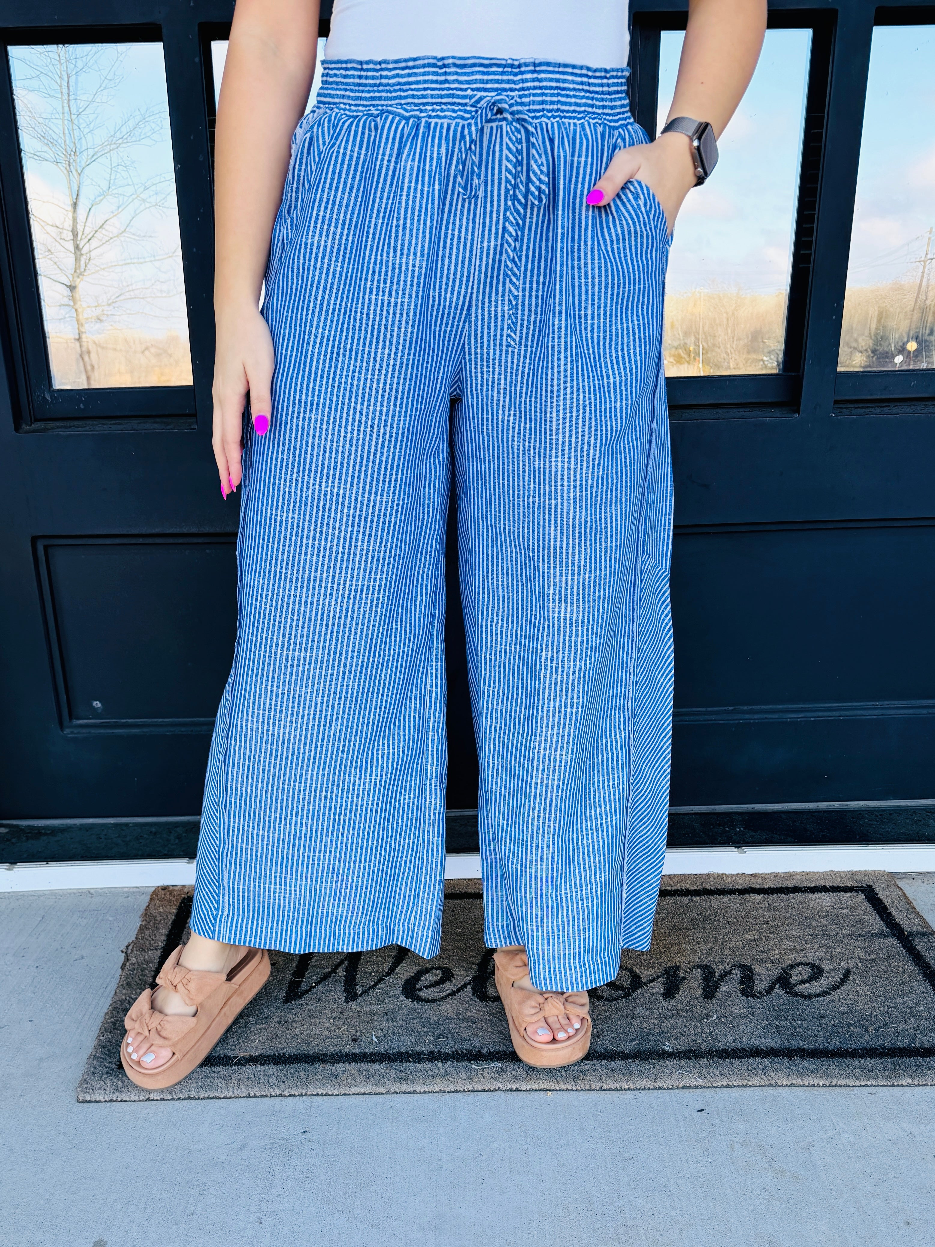 Float through your day in relaxed sophistication with our Make a Wish Striped Linen Wide Leg Pants, now available at Anchored Bliss Boutique in Royse City, TX. Designed with breathable linen blend fabric and classic blue pinstripes, these pants bring together comfort, style, and timeless boutique charm.